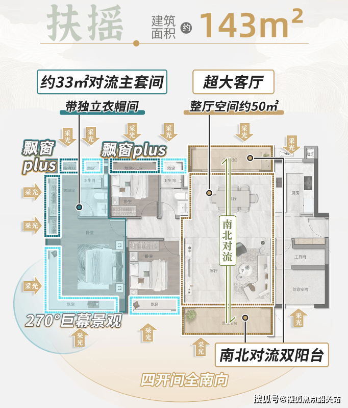 143㎡ 四房两厅两卫:私享“行宫”主卧套房,四开间全南向。