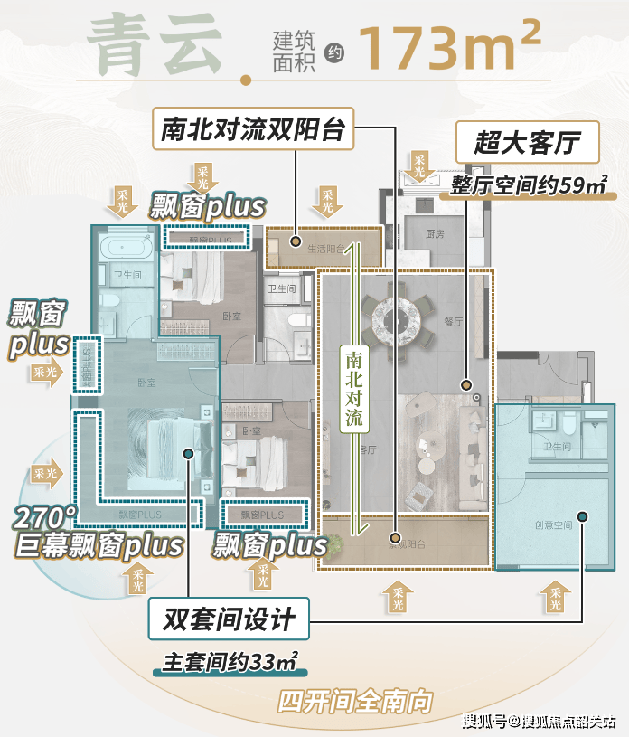173㎡ 四房两厅两卫:两梯两户,南北对流双阳台,豪华主卧套房。