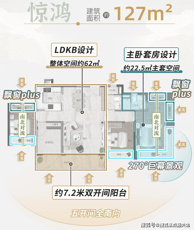 127㎡ 四房两厅两卫:五开间全南向,超22.5㎡主卧套房。