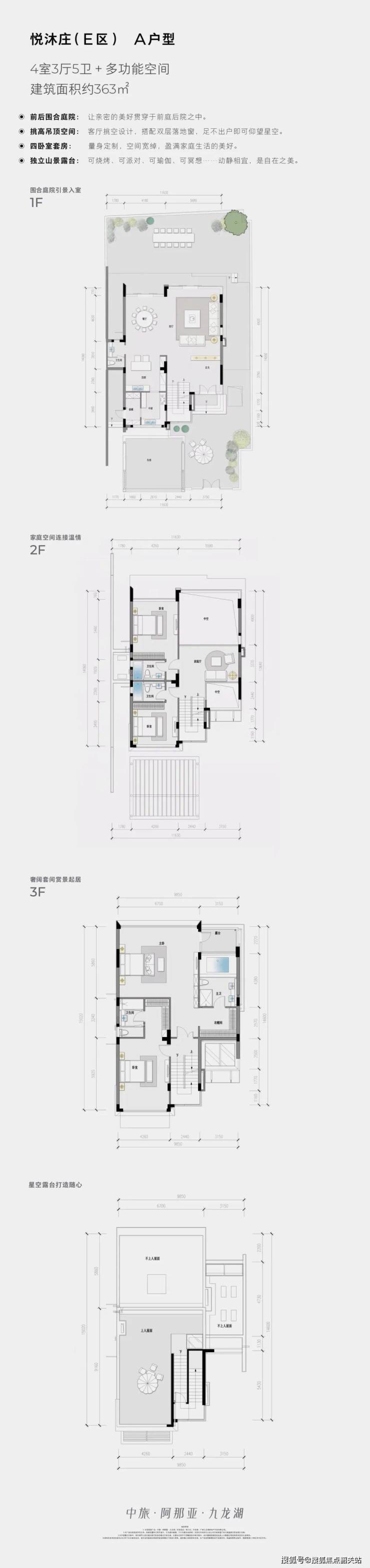 (3)D户型(顶层,175㎡,3房3厅4卫):该户型为大平层的顶层户型,拥有全景视野,可360°欣赏湖山景观,空间布局合理,品质高端,适配高端改善型家庭或度假人群居住。户型南北通透,采光通风极佳,大面宽客厅连接全景露台,视野开阔,可将九龙湖的湖光山色与周边山林景观尽收眼底,露台空间宽敞,可作为休闲区、观景区使用,享受极致的湖山观景体验。主卧朝南,空间宽敞舒适,配备独立卫生间、衣帽间与观景飘窗,私密性强,采光充足,可欣赏湖山景观;另外两个卧室均为套房设计,配备独立卫生间,空间充足,可作为次卧或客房,布局合理,实用性强。户型设计有三个客厅,功能分区明确,公共客厅用于接待宾客,休闲客厅用于家人休闲,私密客厅用于个人放松,灵活满足业主的不同需求;厨房采用L型设计,操作便捷,储物空间充足,通天然气可明火,满足日常烹饪需求;四个卫生间均采用干湿分离设计,设计人性化,提升居住舒适度。该户型顶层位置独特,全景视野,观景效果极佳,同时空间布局合理,品质高端,是追求极致观景体验人群的首选。