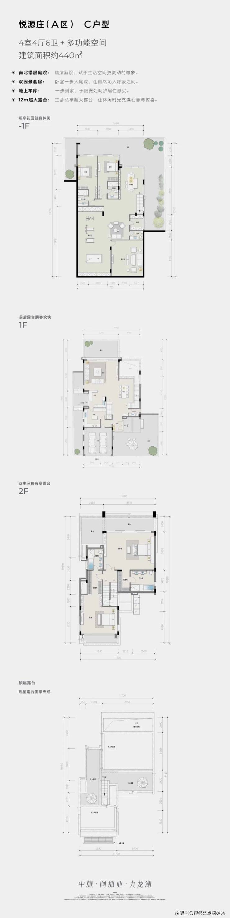 1. A区(悦源庄)-独栋别墅:总户数269套,目前存量5套,户型面积段为354-508㎡,均为70年住宅产权,物业费为5元/㎡,由启胜物业负责管理,交付标准均为毛坯交付,停车方式为私家车库,参考单价为2.3-2.4万,具体价格一房一价。该区域别墅均为独栋设计,私密性强,依托项目的生态资源,打造舒适的湖山别墅生活,户型布局合理,功能齐全,空间宽敞,适配高端改善型家庭或顶豪人群居住,其中C户型建筑面积约440㎡,布局奢华,功能完善,是存量房中的热门户型。
