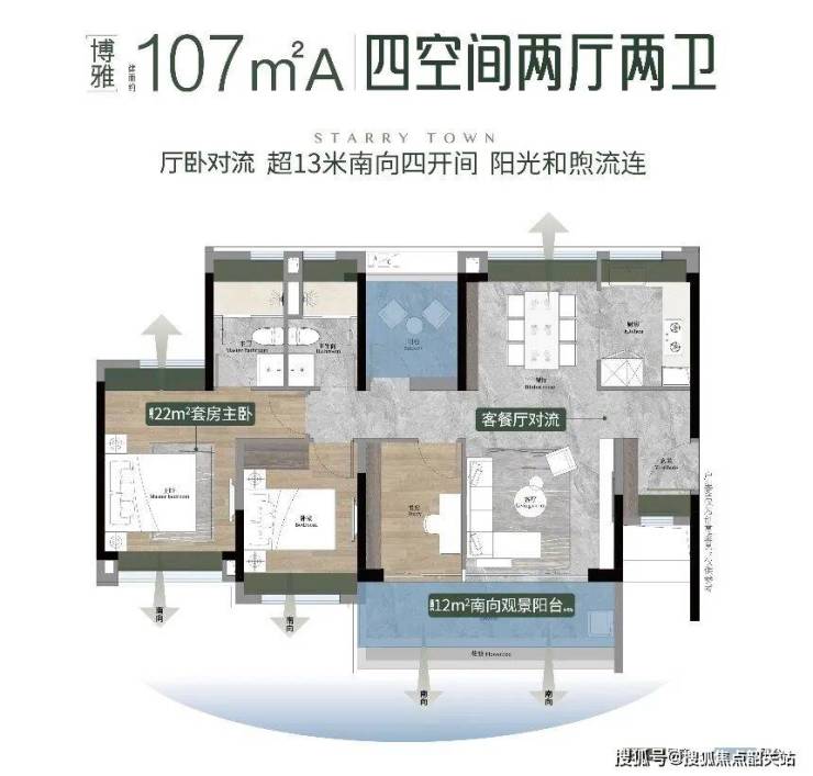 107㎡A户型设有南向观景玄关,入户仪式感十足,客厅和主卧双南北对流,交互式方厅灵活多变;107㎡B户型四开间朝南,经典竖厅设计,动静分区合理,主卧自带独立衣帽间,满足二胎家庭及高品质生活的多功能需求。户型设计充分体现对舒适度、实用性和美观性的综合考量,兼顾生活便捷和居家幸福感。