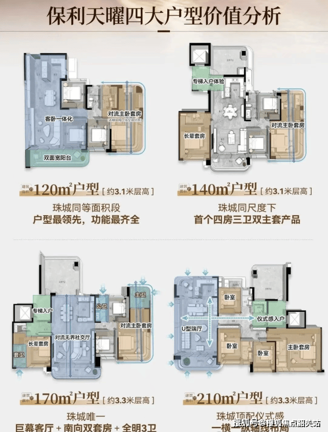 保利天曜分为南北两个地块进行开发,其中南地块采用板楼设计,共有8栋楼;北地块则采用塔楼设计,共3栋楼。南地块的主力户型为120-210平方米的四房,而北地块的户型则更加多样化。所有建筑均采用了现代设计理念,注重通风采光,部分户型还能享受侧向江景和珠城景观。此外,项目还配备了“六恒系统”,通过智能化技术保证室内环境的舒适度。