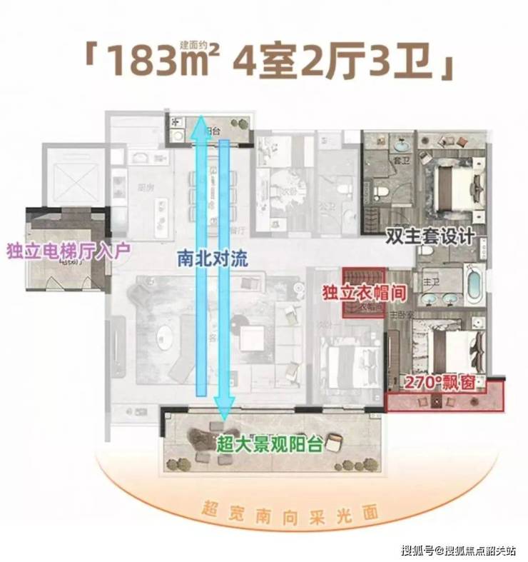 答:项目采用两梯三户的全南向板式设计,涵盖122㎡至186㎡的大户型,注重通风采光和观景视野的最大化。