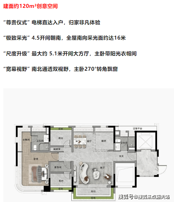 户型设计上,全部实现了LDKG大方厅(客餐厨阳台一体化),主卧标配270°转角飘窗,最大采光面约16米,极致4.5面宽朝南。使用率更是惊人,达到了94%-105%,比市场上同尺度的户型高出了5-10%。什么意思呢?就是你买140平的房子,能体验到别人180平的空间感。特别是那个专梯入户的设计,即使是最小面积的户型,也能享受类似候梯厅入户的尊崇体验,电梯厅面积约10平米,私密性和仪式感拉满。这种“小面积、大享受”的设计思路,精准击中了当下改善型客户的痛点。