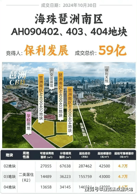 2024年10月30日,保利发展以59亿+的总价拿下了广州“压箱底”的靓地——琶洲南三兄弟(AH090402号、03号、04号地块)。这三块地位于琶洲南TOD项目的东侧,占地面积约6.66公顷,总建筑面积达12.8万平方米,楼面价为4.25万-4.3万元/平方米。尽管地块现状还是一宗无路无桥的生地,但这并未影响这家央企的拿地热情。作为琶洲进阶扩容的重要平台,琶洲南区不仅地段优越,景观资源也十分丰富,具备做改善产品的条件。