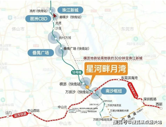 尽管地处南沙腹地,但星河·畔月湾的交通能级不容小觑。项目距地铁18号线横沥站约3公里,虽需依赖即将开通的免费业主楼巴接驳,但18号线作为全国最快地铁(时速160km/h),仅4站即可直达珠江新城冼村站,真正实现“半小时进天河”。更关键的是,项目距规划中的南沙枢纽站仅5公里——该站未来将接入深江高铁、广中珠澳高铁等14条轨道线路,成为湾区“超级十字路口”。自驾方面,门前灵新大道为南沙第二主轴,直连凤凰大道与深中通道广州支线,未来经深中通道赴深圳前海仅需30分钟。虽然当前通勤仍需一定时间成本,但随着2026-2027年南沙枢纽与横沥岛基建全面兑现,区位价值将迎来质变。