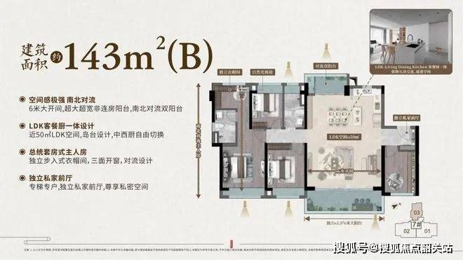 143㎡凤栖梧:该户型设计巧妙,超高使用率,LDK空间接近60㎡,空间感极佳。大阳台+双对流设计,采光通风俱佳;自带独立衣帽间的三窗主人房,尽享超尺度空间体验。