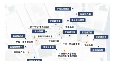 中海亚运城总占地面积 273 万平方米,总建筑面积 500 万平方米,历经多次股权变更后由中海全资控股,物业为中海物业。项目规划 3/4/8 号线三地铁,3 号线东延段海傍站已开通。内部规划 19 所全龄学府(已开学 18 所)、约 40 万方商业、三甲广医二院番禺院区及运动场馆等。规划理念是打造全龄段宜居生活大城,以超级大盘规模整合优质资源,满足业主从教育、生活、医疗到运动的全方面需求,提供一站式居住解决方案。