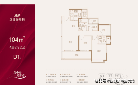 103㎡舒居四房:三开间朝南,6.3米超大阳台连通U型厨房,空间通透,功能齐全,是刚需家庭“买得起又住得爽”的理想选择;