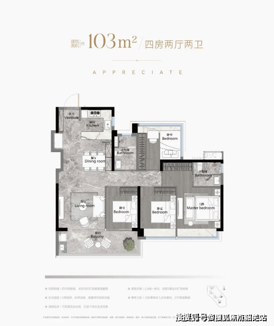 103㎡户型:南向四开间、12米采光面、主卧套房带飘窗,实际使用面积超130㎡,总价460-510万。