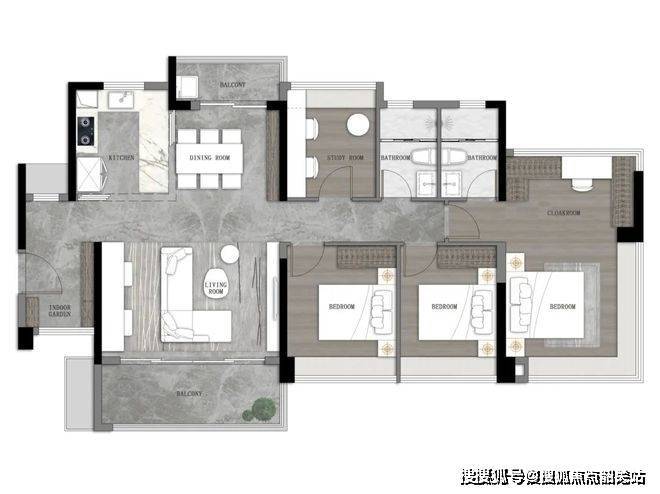建面约103㎡户型,在入户处新增了一个房间做到四房,布局也变成了横厅布局,南北对流更加通透。