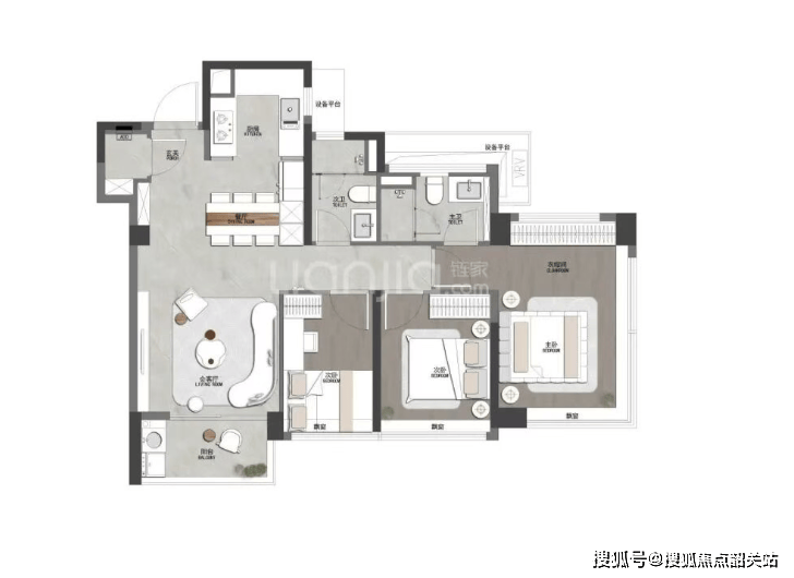 ✅ 107/110㎡四房:LDK一体化+超大观景阳台,公区尺度媲美改善盘;