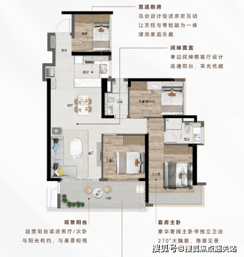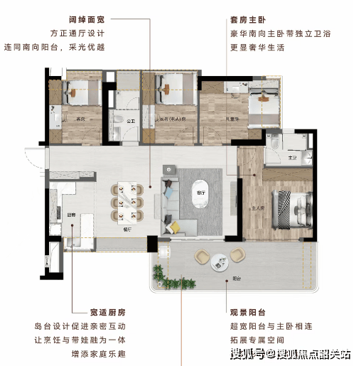 108㎡四房两厅两卫:南向无遮挡,U型厨房设计,观景阳台提供IMAX版厅视觉效果,享有超广角江景视野。