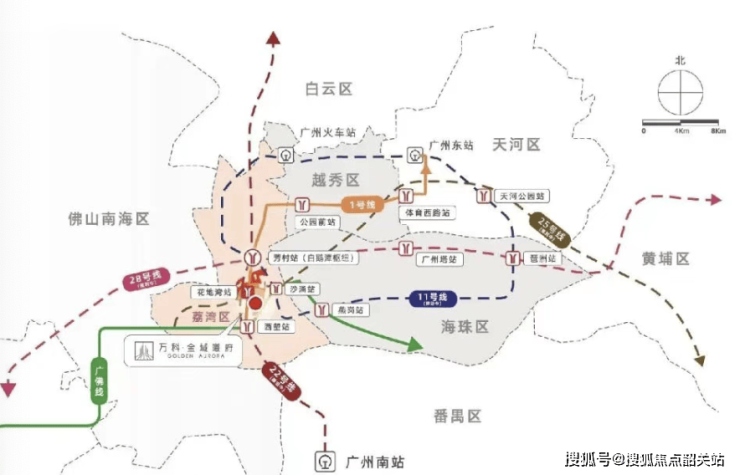 在现代都市生活中,时间是最宝贵的财富,而交通的便捷度直接决定了时间的利用效率与生活半径的广度,【万科·金域曦府】凭借其得天独厚的地理位置与完善的路网结构,构建了“地铁 + 自驾 + 公交”的立体交通体系,实现了数据化的全城通达,让出行变得高效而从容,真正做到了“出则繁华”。首先,在轨道交通方面,项目最大的亮点在于其“黄金地铁1号线”的超强配置。黄金地铁1号线花地湾站旁,从花地湾站出发:1站达白鹅潭交通枢纽;6站直达公园前站北京路商圈;直达体育西,畅享吃喝玩乐。广州地铁1号线接驳地铁2号线、3号线、5号线、6号线、广佛线,通达天河、越秀、海珠、白云各区。根据广州地铁官方运营数据及规划,从项目乘坐地铁可快速到达珠江新城、金融城、琶洲、越秀区核心等商务区,通勤效率极高。特别是1号线作为广州东西向大动脉的优势,将实现“快速直达天河,快速直达越秀”的极速通勤。