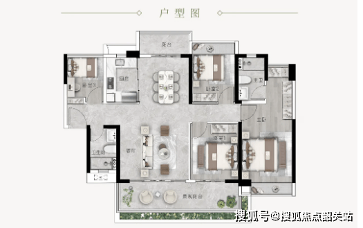 户型特色:该户型为高端改善型户型,使用率超100%,是观璟组团的明星户型,空间尺度优越,户户朝南,视野无遮挡,可享受一线湖景和园林景观,南北通透,采光通风效果极佳。布局上采用阔绰四房设计,动静分区清晰,公共区域宽敞大气,私密区域静谧舒适;客厅大面宽设计,搭配超大景观阳台,将社区美景尽收眼底,适合家人休闲、接待宾客;主卧套间设计,配备独立卫生间、衣帽间和飘窗,空间宽敞舒适,私密性极强,提升主人居住体验;三个次卧均朝南,空间宽敞明亮,其中一个次卧可改造为书房、茶室或儿童房,灵活适配家庭需求;厨房采用U型设计,操作空间充足,配备西门子厨房三件套(油烟机、燃气灶、洗碗机),提升烹饪体验;两个卫生间干湿分离,配备智能马桶,细节之处彰显品质。该户型适合多人口家庭、高端改善型客户,空间阔绰、品质出众,能够满足对居住舒适度和品质有较高要求的业主。