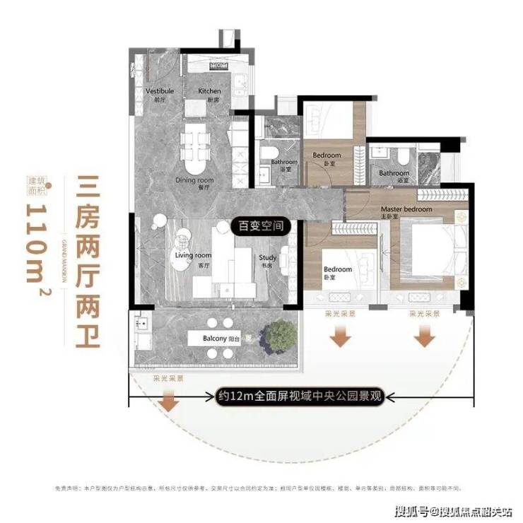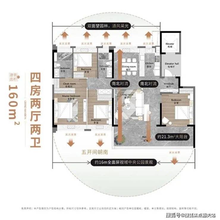 建面约110-160㎡低密全景板式奢宅:首期容积率仅为2.7,采用16-24层的小高层设计,全盘仅872户,保证了住户的私密性和舒适度。所有户型均为全南向设计,户户朝南,享有270°极致景观视野。