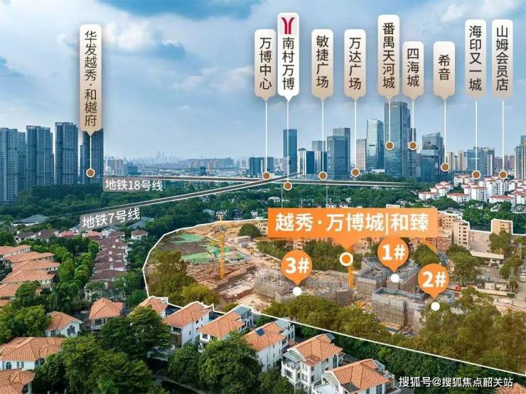 项目到南村万博E2口约1公里,可以乘坐7号线18号线,7号线往西通到南站和佛山的顺德美的大道。往东北方向连接我们的大学城,然后上去科学城的燕山站,把东部连起来啊。18号线从南沙天河,南北贯通,3站琶洲,4站冼村。后期往南通中山,往北到花都。