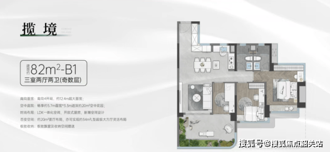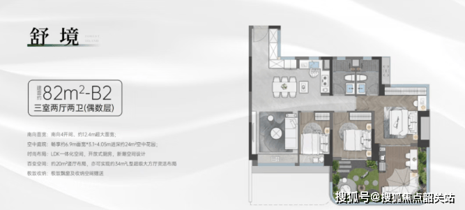 82㎡:三房两卫,竖厅格局,客厅可与次卧打通成超级大方厅,南向面宽达12.4米。