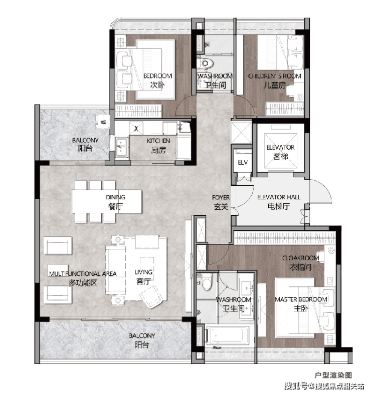 建面约200平方米的四房户型:拥有宽敞的电梯间和独立入户玄关,确保了私密性。南北双阳台设计,其中约7.5米超大阳台环绕客厅,为业主提供了舒适的休闲空间。