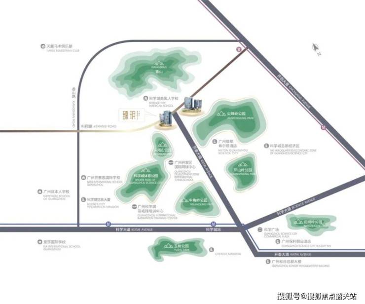 环绕香山、尖峰岭、尖塔山三座自然山体科学城体育公园·玉树公园·环山岭公园·牛角岭公园·边岗岭公园五大公园;拥揽映日桥、揽月桥等六座空中连廊,串联约13.12公里的科学城云端绿道,畅享国际森活方式