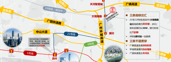 东基天河阳光距离21号线大观南路站仅800米,另有4号线黄村站和未来的19号线加持,形成三地铁环绕的便捷交通网络。驾车出行也十分方便,通过广园快速路、中山大道等主要道路,可迅速到达金融城、珠江新城以及琶洲会展中心等地。第二机场高速(建设中)将进一步缩短到白云机场的时间至30分钟内。