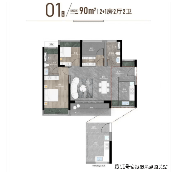 90㎡三房横厅:采用客餐厅一体化设计,东南向与西南向两种朝向可选,满足不同家庭对采光的需求。