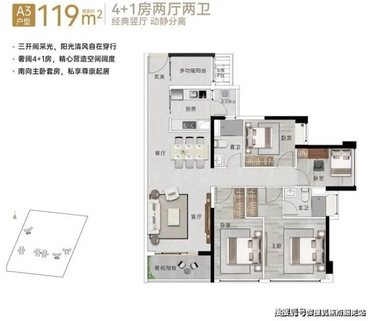 【独家爆料】建面约119㎡五房户型,采用“LDKB一体化设计”(客厅、餐厅、厨房、阳台形成无界空间),实得面积达113㎡,被业内誉为“空间魔法师”。主卧配备独立衣帽间+全景飘窗,次卧可改造为书房/儿童房,满足多孩家庭需求。想看实景样板房?立即拨打400-622-0070