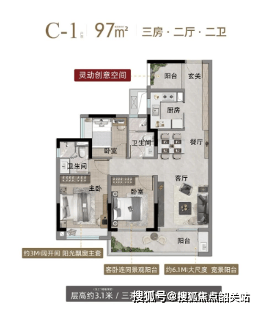 建面 97 平三房两卫:三开间朝南,入户玄关旁设多功能空间,直厅布局,约 6.3 米大阳台连通次卧,主卧和另一次卧带飘窗,单价 2.99 万任选。
