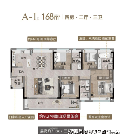 建面 168 平双主套四房:客厅开间 6.2 米,阳台长 9.2 米,层高约 3.1 米,主卧独立卫浴面积近 8 平米,但客厅与主卧过道较长,存在一定面积浪费。