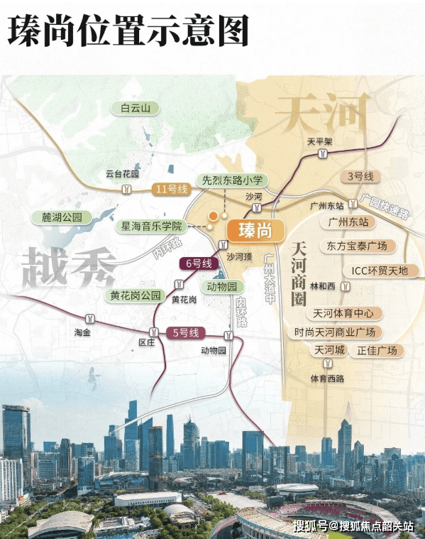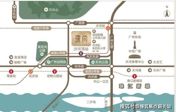 瑧尚坐拥广州罕见的三地铁交汇优势——5号线、6号线与即将全线贯通的11号线环线在此交织。项目距离6号线沙河顶站B出口仅约500米,步行即可抵达。通过6号线,1站换乘11号线(广州首条大环线),2站直达区庄换乘5号线,3站至淘金,6站即达北京路、珠江新城,一线直达琶洲。