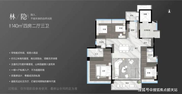 140㎡四房:位于9/10/11/15/16/17/18栋,总价约1190万元起,双套房设计,南向面宽超10米,私梯入户,全明电梯厅可纳入户内空间;