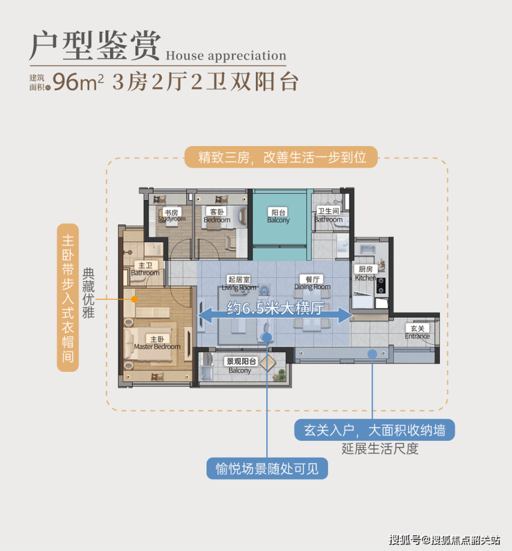建面约96㎡ 南北通透四房:约6.5米大横厅,主卧带步入式衣帽间,改善生活一步到位。