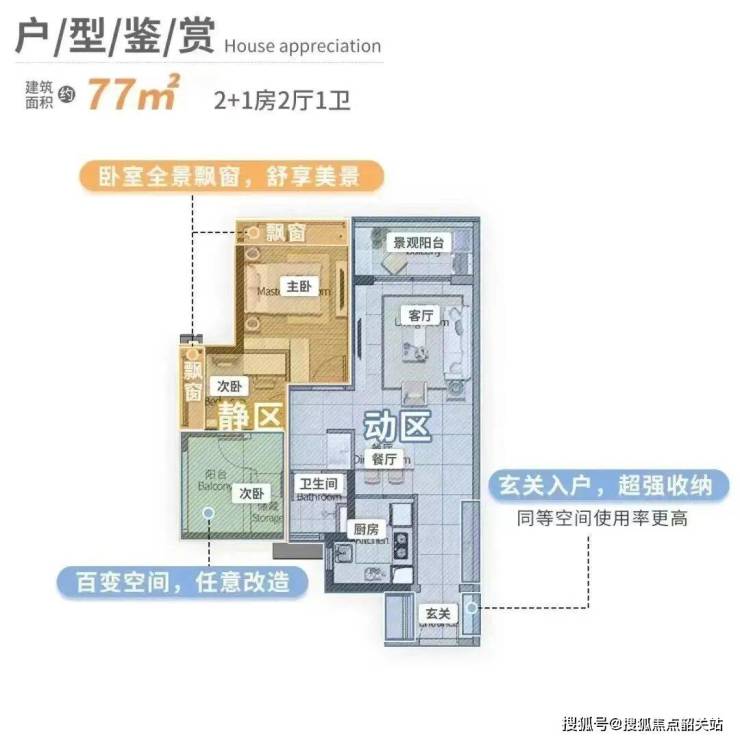 建面约77㎡ 高性价比阳光三房:客厅开间约3.4米,采光充足,百变空间。
