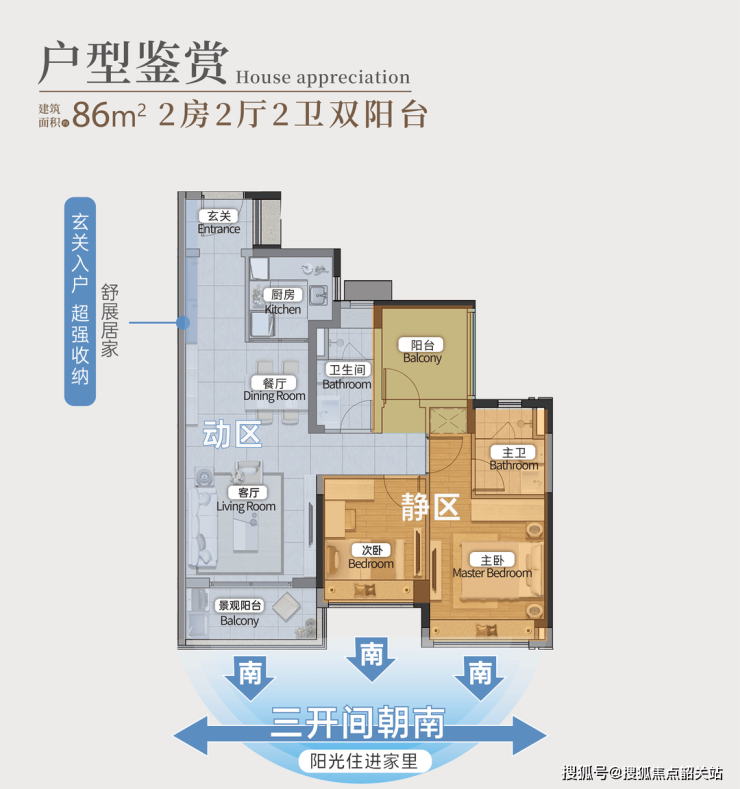 建面约86㎡ 东南向望园三房两卫:经典竖厅设计,南向正望园林,客厅开间约3.5米。