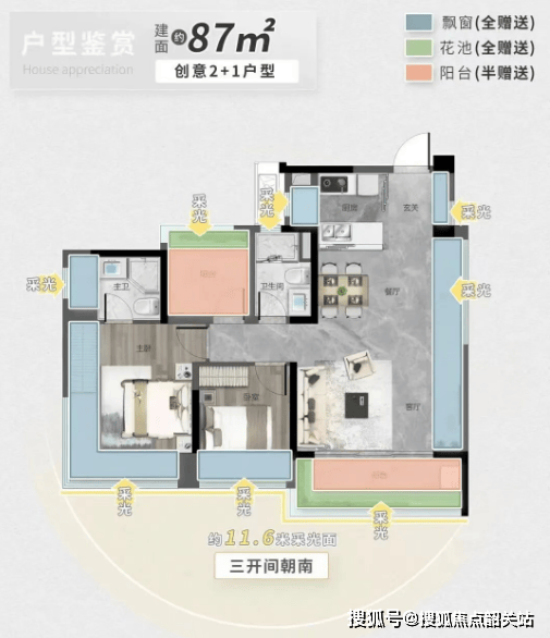 87B户型:宽幕客厅设计,近110%使用空间,酒店套房式主卧,居境升级。