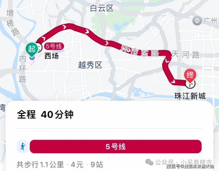 地铁去珠江新城:步行至西场站,乘坐5号线直达珠江新城,全程9个站,耗时40分钟左右。