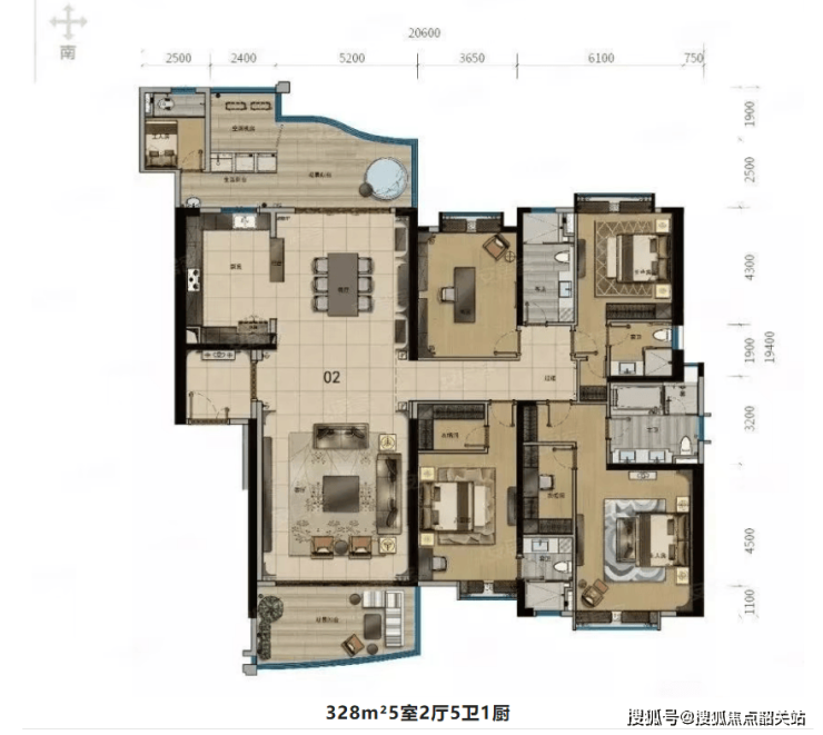 328㎡ 5 室 2 厅 5 卫 1 厨:约 4 米层高,约 6.7 米超大开间连接餐客厅与观景阳台,南北对流、全屋通透,穿堂风贯穿,居住舒适度拉满;五房设计,主卧套房带独立衣帽间、卫浴,次卧空间开阔,兼顾家庭居住与私密需求,得房率高,空间利用率极强。