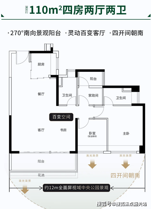 项目被约 90 万㎡中央公园环抱,相当于 1.6 个花城广场,其中 11 万㎡古树公园由国际大师 SWA 设计,首期已交付。建筑采用全玻璃幕墙设计,南偏 20° 布局,一线楼栋享 280 米景观面,实现与自然无界融合。在售约 110-175㎡3+1 房至四房,全南向设计,两梯两户为主,专梯独户保障私密,约 136㎡四房更是畅销户型升级版,主卧套房设计亮点突出。