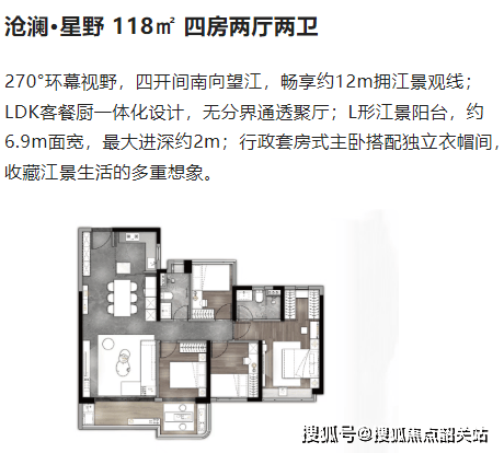 同样具备 270° 环幕视野,四开间南向望江,畅享约 12m 拥江景观线。LDK 客餐厨一体化设计,使空间通透开阔。L 形江景阳台约 6.9m 面宽,最大进深约 2m,可尽情享受江景。行政套房式主卧搭配独立衣帽间,满足业主对品质生活的追求,收藏江景生活的多重想象。