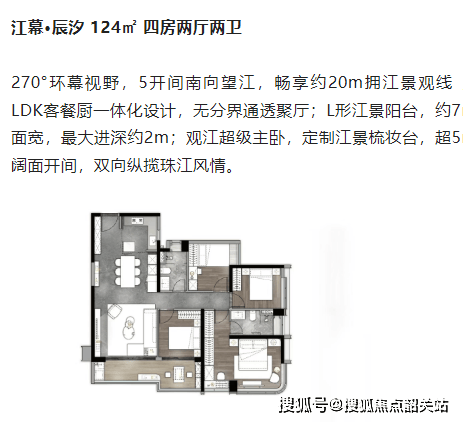 拥有 270° 环幕视野,5 开间南向望江,畅享约 20m 拥江景观线,让江景成为生活的日常画卷。LDK 客餐厨一体化设计,无分界通透聚厅,营造宽敞舒适的公共活动空间。L 形江景阳台约 7m 面宽,最大进深约 2m,为休闲观景提供绝佳场所。观江超级主卧定制江景梳妆台,超 5m 阔面开间,双向纵揽珠江风情,为业主打造尊贵舒适的私人空间。