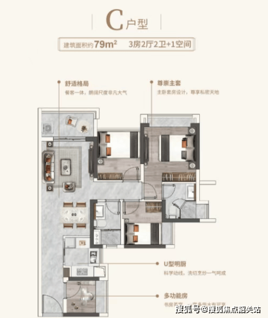 79㎡四房两厅两卫:餐客一体,朗阔通透;主卧套房设计,私密尊享;U型厨房动线科学;更巧妙设置书房/茶室,一室多用;