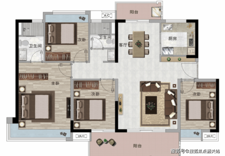 约 126 - 138㎡户型:南北通透,双阳台设计,主卧约 270° 转角飘窗,南向约 6 米大阳台,居住体验舒适。