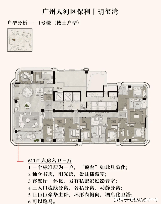 如果要选出保利玥玺湾的“皇冠上的明珠”,那非1号楼莫属。作为整个项目最大的户型,1号楼提供了建筑面积约611平方米的超级大平层。更为惊人的是,它采用了一层一户的设计。