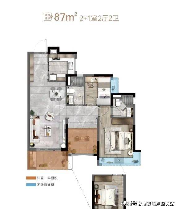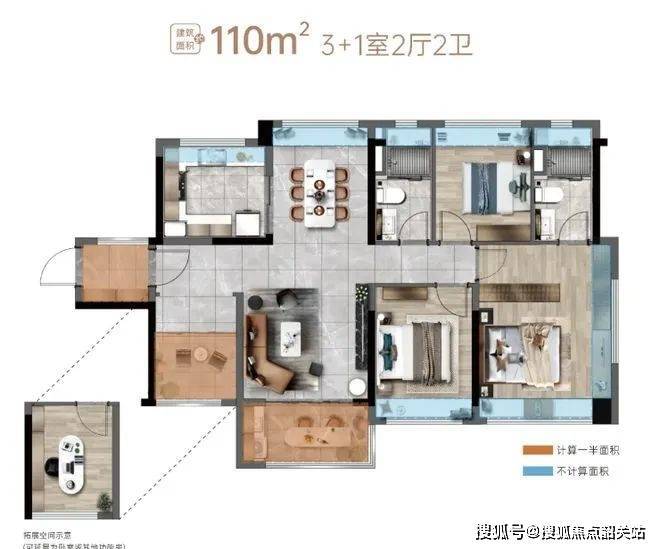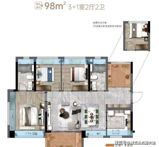 :可能是四居室或更多功能区户型,满足大家庭或对空间有较高要求家庭。宽敞客厅、豪华主卧套房,可能配备独立书房、衣帽间等功能区。多个阳台或大飘窗设计,充分利用景观资源,提升居住品质与舒适度。