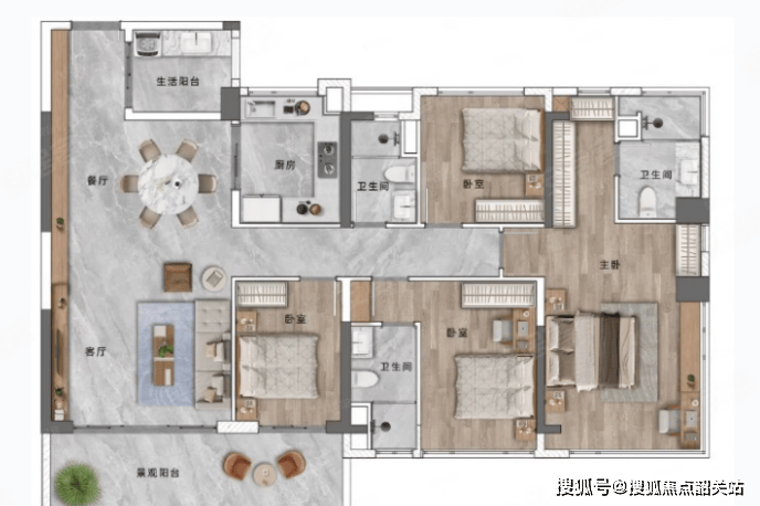 139㎡户型:厨卫全明,大阳台,双卫生间,主卧套房。