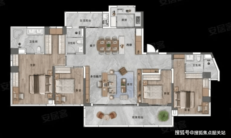 187㎡户型:南北通透,厨卫全明,大阳台,双卫生间。