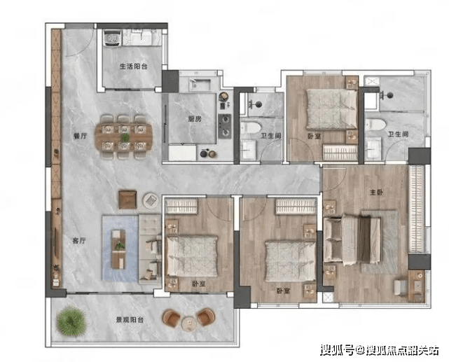 165㎡户型:厨卫全明,大阳台,双卫生间,双阳台。