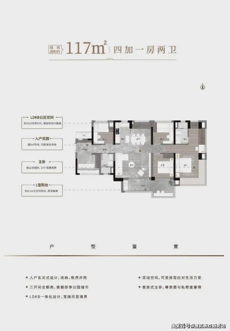 117㎡五房:独立衣帽间+双台盆主卫,改善型首选,总价415万起。