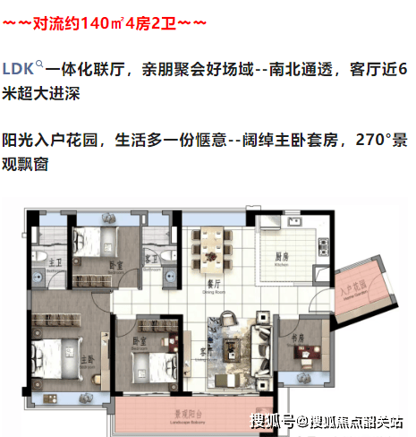 项目采用环抱式高层布局,保证各户视野与日照。平层户型多样,从 84㎡的 2 + 1 房 1 卫低门槛上车户型,到 196㎡的奢华大平层均有涵盖。各户型设计注重采光与景观,如南向 99㎡的 3 + 1 房 2 卫户型,拥有约 6 米阳台;140㎡的 4 房 2 卫户型,LDK 一体化联厅,南北通透,客厅进深近 6 米,还有阳光入户花园。